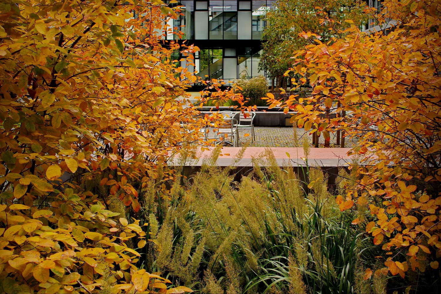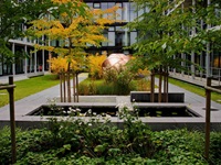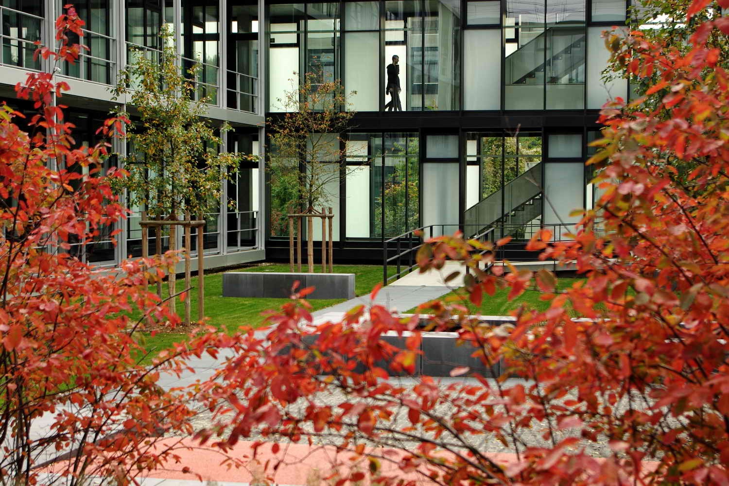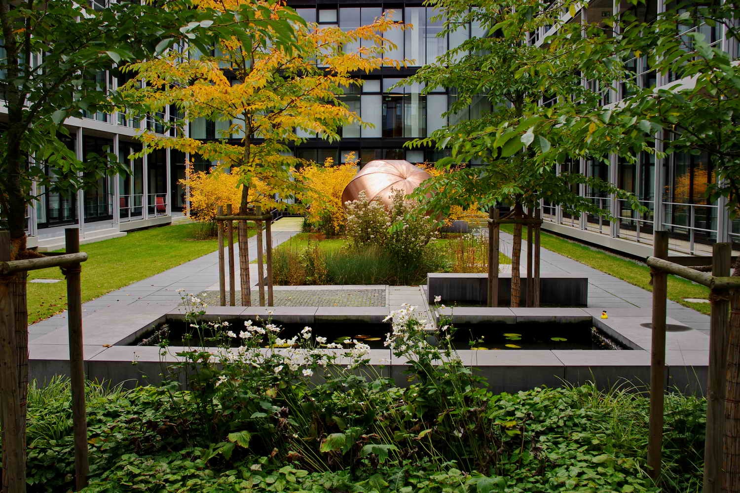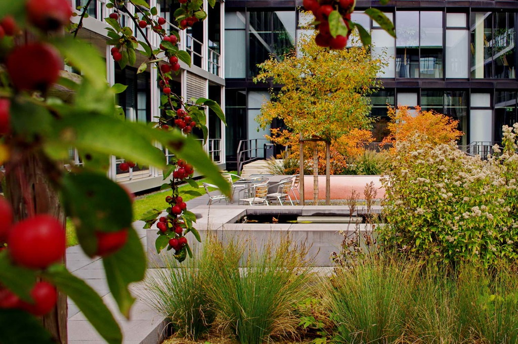 Durchstreift man die beiden neuen Innenhöfe, ist von der schwierigen und langwierigen Realisierung nichts mehr zu ahnen. Ruhige Gartenräume mit wenigen Elementen, die seit jeher einen Garten ausmachen: Wasser, Wege, Bäume, Blumen, Rasen. Die Höfe sind barrierefrei erreichbar, können so leicht in die Alltagswege durch die weitläufigen Gebäude eingebunden oder als Pausenort genutzt werden. Beim Blick aus dem Fenster bilden sich die Jahreszeiten in Blüten, Früchten und Laubfarben ab.