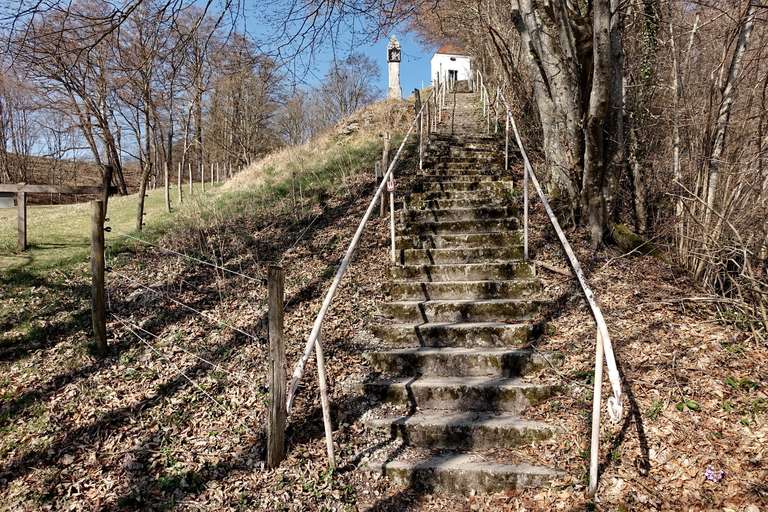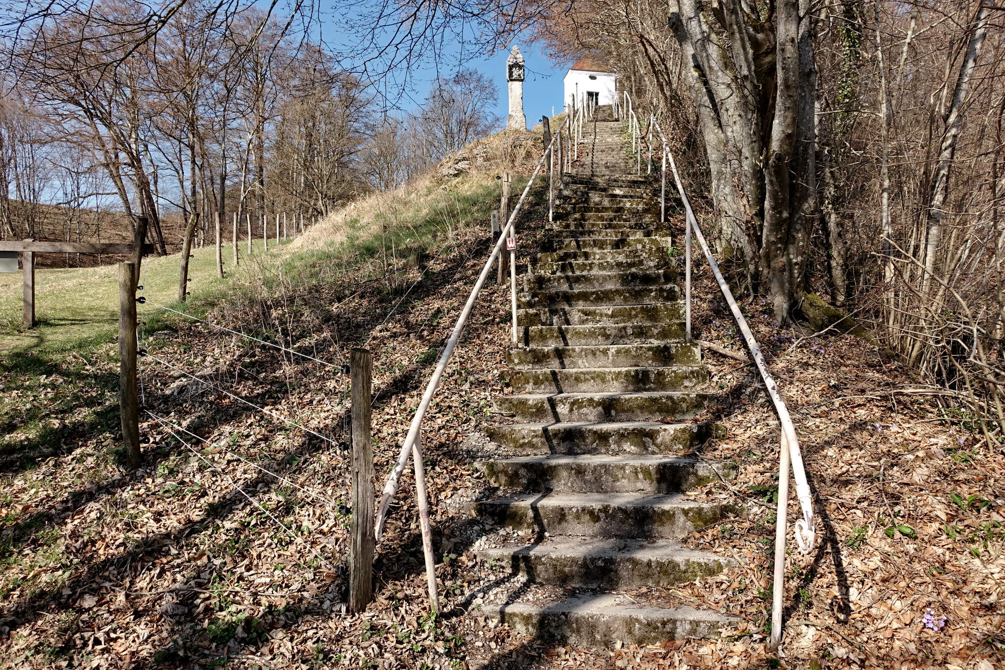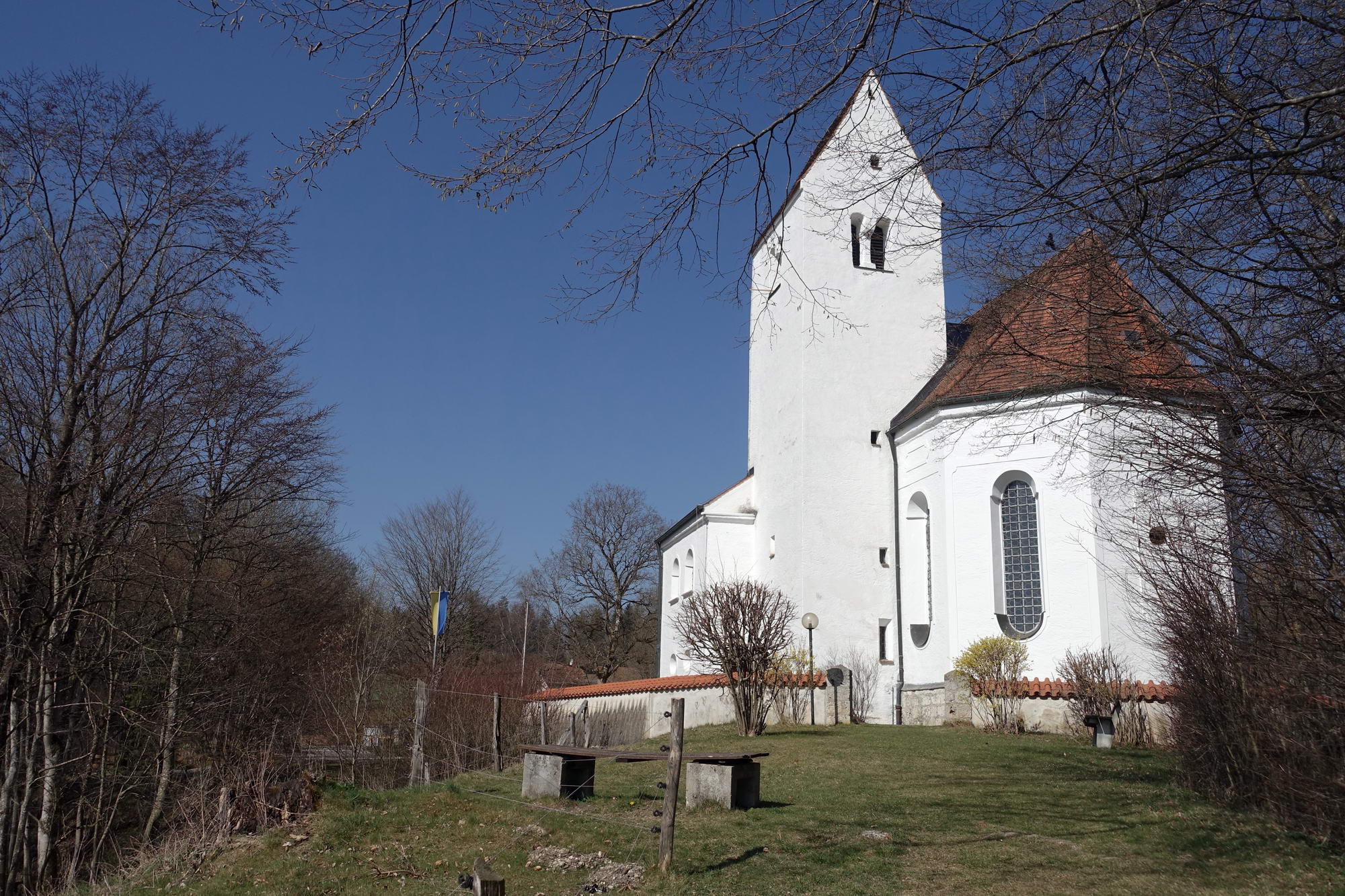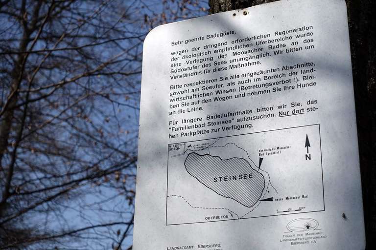 Erste Zwischenstation ist das Kircherl von Maria Altenburg, wunderbar gelegen auf einem Geländesporn hoch über den Fischteichen an der Moosach. Die spätmittelalterliche Wallfahrtskirche wurde an Stelle einer Burgkapelle errichtet und um 1711 barockisiert. Wir können nicht hineinschauen, weil Messe ist: „Oh Haupt voll Blut und Wunden“ singt die Gemeinde gerade, als wir vorbeigehen, im Kirchhof flattert die Flagge der Ukraine im frischen Morgenwind. Der kleine Biergarten „Sacherl“ nebenan hat noch geschlossen (öffnet am 2.4.22). Schade aber egal, wir werden nicht verdursten. Nach einer Waldpassage erreichen wir das nördliche Ufer des Steinsees. Wer dringenden Einkehrwunsch verspürt muss eine Variante am Westufer wählen, dort wird man fündig. Wir wählen die abseitigere Strecke um die Ostseite des Sees, aber das ist ein ausgeprägtes Spaziergängerrevier hier. Wegen Übernutzung der Ufer mussten diese weiträumig eingezäunt werden. Am Ostufer gibt es noch einen kleinen Zugang mit Bademöglichkeit und entsprechende Informationstafeln. Hoffentlich nützen sie was. Es heißt, man schützt, was man liebt. Was die Liebe zur Natur angeht, geht diese Liebe sehr oft nicht mit besonderer Rücksichtnahme einher. Immerhin ist der See seit 2004 nicht mehr in Privatbesitz. Damals gelang es dem Freistaat, sein Vorkaufsrecht zu nutzen, erst danach ließen sich Maßnahmen zum dauerhaften Erhalt der ökologischen Funktionen des Sees und seiner Uferzone ergreifen.