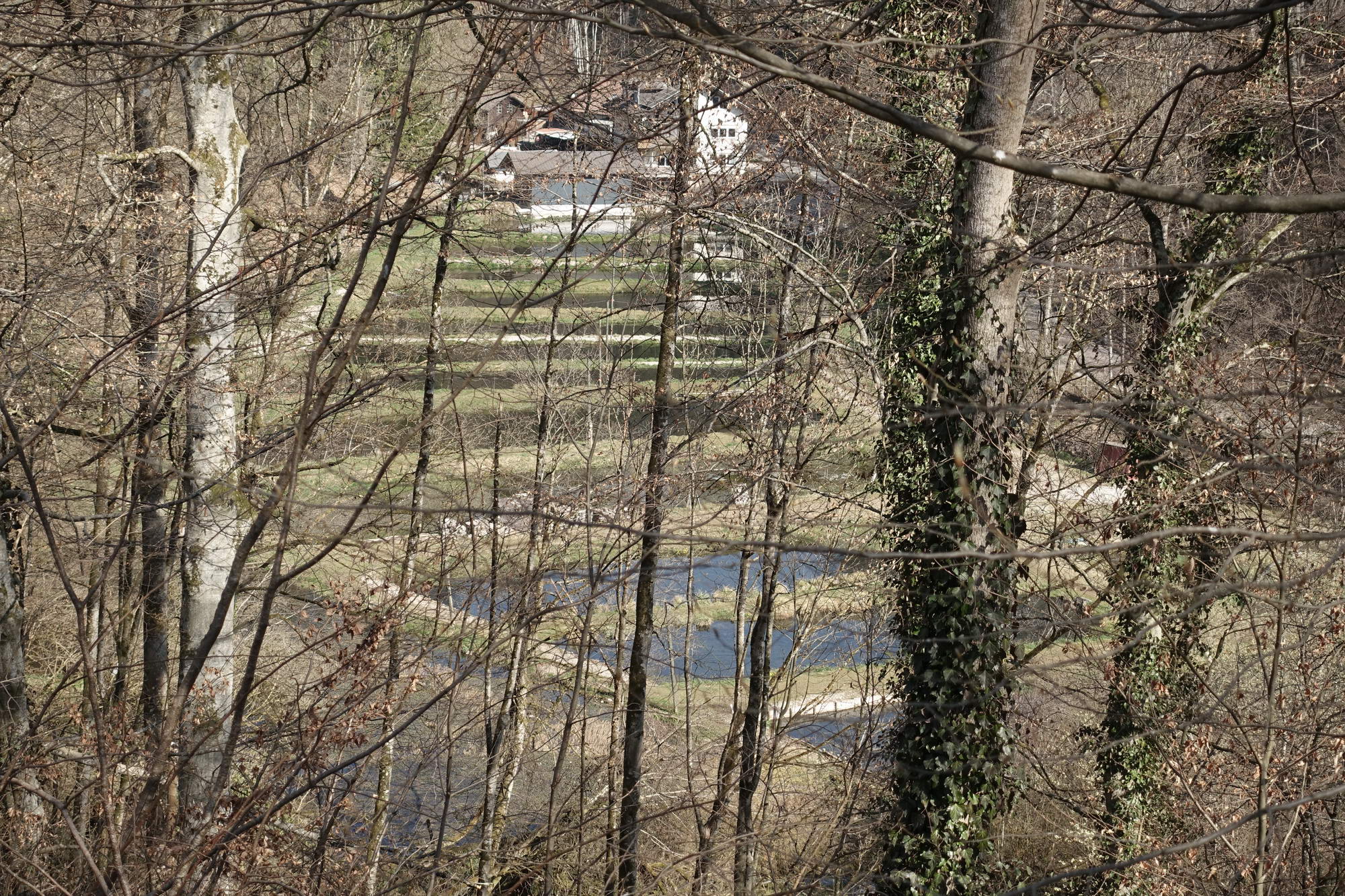 Durch Wald und Feld geht es weiter nach Kastenseeon, wo der Toteisweiher im Sommer wohl einen regen Badebetrieb hat und ein Pferdeaktivhof oder so ähnlich gut besucht ist. Bei Lindach gäbe es schönen Bergblick, wäre es nicht so extrem dunstig heute. Zwischen Lindach und Aying erleben wir die Topographie im Wald besonders bewegt, weil wir nun die Moränenwälle queren, hinaus aus dem ehemaligen Gletscherfeld. Man sieht die Schutthäufen der Gletschermoränen vor dem inneren Auge förmlich vor sich.