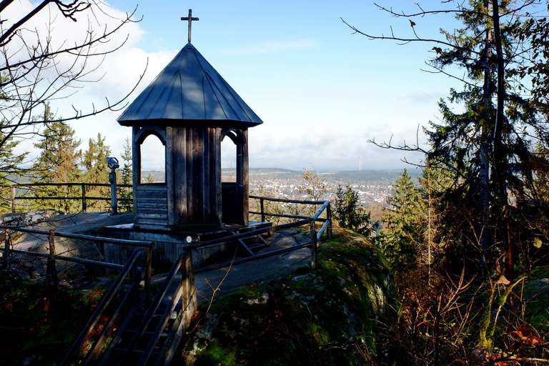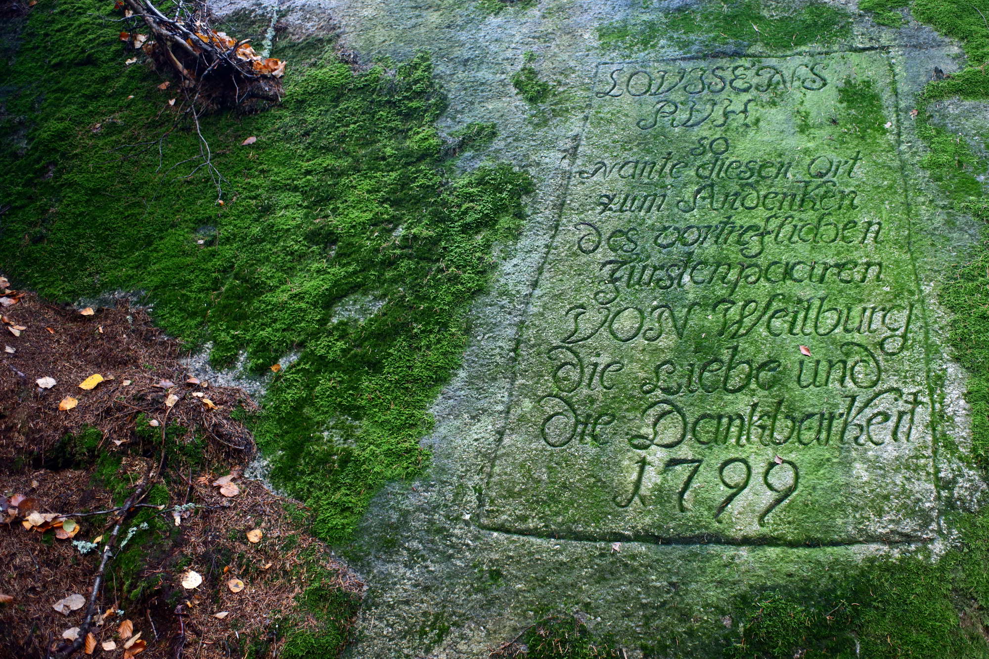 Das für mich Besondere: hier ist einer der Orte, an denen Wandern und Naturgenuss, wie wir sie heute pflegen, quasi erfunden wurden, im Geist einer bürgerlichen Aufklärung. Es war eine Gesellschaft von wohlhabenden Bürgern Wunsiedels, die den Felstrümmerhaufen im Bergwald unter dem Burgstein, der damals Luchsburg hieß, als Ausflugsziel entdeckte und mit Wegen erschloss, ab ca. 1790. Wenige Jahre vorher war es sozusagen in Mode gekommen, sich draußen im Freien, gar in der freien Landschaft auf eigenen Beinen und zum bloßen Zeitvertreib fortzubewegen. Was vorher schreckliches Gebirge war, wurde als pittoreske Natur entdeckt. Vorher unerreichbare Felstürme wurden als Aussichtspunkte zugänglich gemacht, hier und dort Lauben zum geselligen Aufenthalt installiert. Malerische Landschaft wurde nun zur Erbauung und als Freizeitvergnügen besucht und konsumiert. Alles, was heute touristisch im übergroß landschaftszerstörenden Ausmaß passiert, nahm damals seinen Anfang.