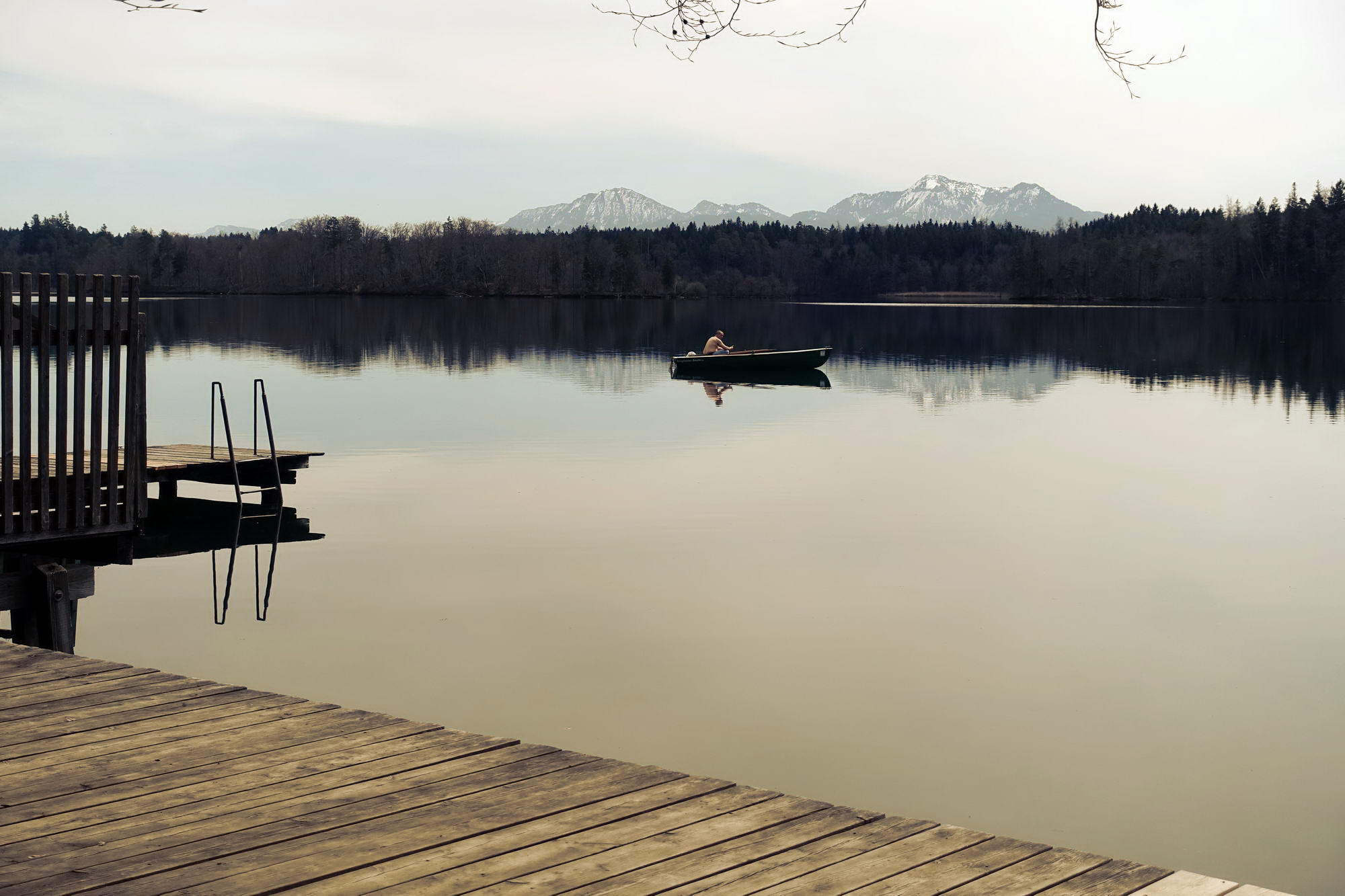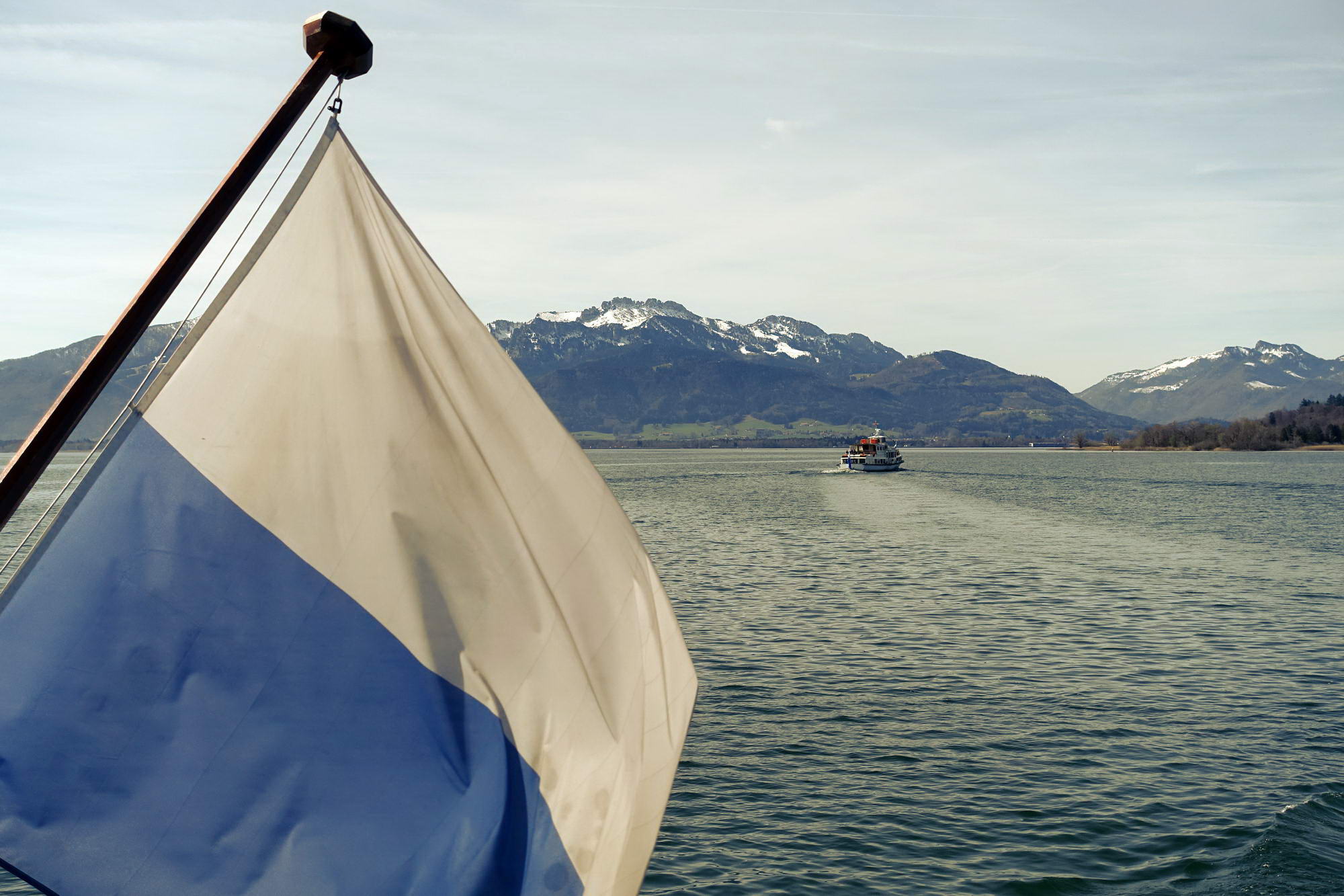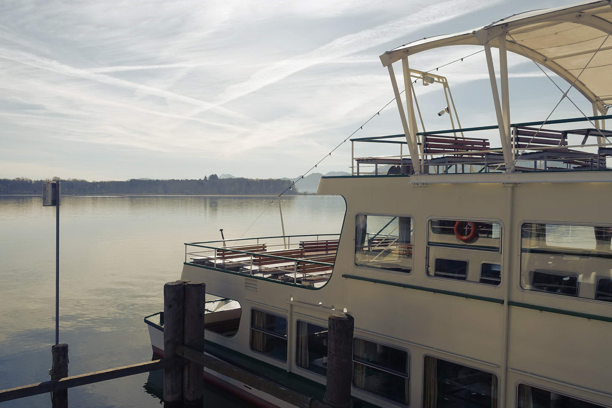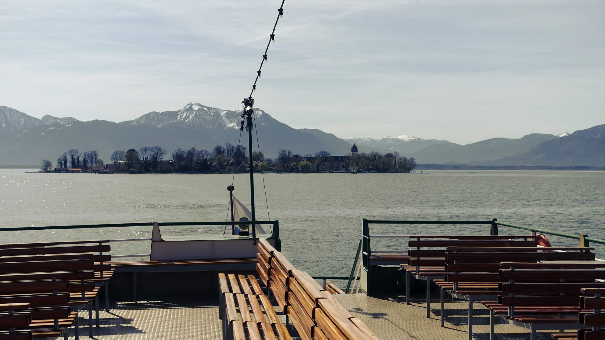 Vielleicht ist die Jahreszeit noch etwas früh für den Chiemgau, der seine Opulenz erst im Sommer so richtig ausspielt. Hofmiller nannte ihn ungemein malerisch und beschrieb überschwänglich die Weichheit von Formen und Farben, in der Landschaft und am Himmel. Steub spricht vom belvederischen Charakter der Landschaft, einem so geschickt angeordneten, wogenden Hügelland, dass sich dem Wanderer im Auf und Ab des Geländes ständig neue Aussichten bieten. Jetzt, im beginnenden Frühling, die Bäume noch ohne Laub, ist alles transparent, aber bereits mit grünem Hauch unterlegt. Und tatsächlich ist der Himmel seidig-weich gezeichnet an diesem noch kühlen Morgen, als wir das Schiff besteigen.