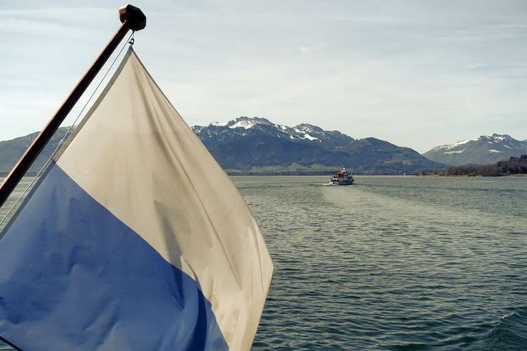 Das Übersetzen mit dem Morgenschiff ist perfekt, es verliert nahezu seine gesamte Ladung auf den Inseln, dem eigentlichen Ziel der Ausflügler seit eh und je, und wir reisen fast alleine weiter nach Gstadt, eine seltene Gelegenheit. Man sieht sich kaum satt an den stets wechselnden Perpektiven zwischen den Inseln hindurch auf die Alpenkette, „die alltägliche Waldgegend, ein niederes Gestade mit Nadelholz bewachsen“ am Nordufer, wie sie „in der Mark, in Pommern oder in Preußen auch zu finden sein möchte“ (Steub) interessiert da kaum. In dieses Gelände allerdings soll unsere Frühlingswanderung führen.