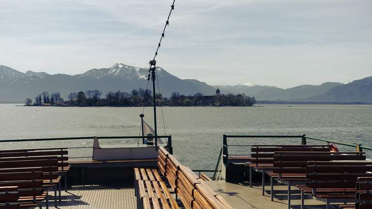 Im Rahmen des Komoot-Events MitWandern 2021 war unser Beitrag schon so eine 1,5 Tage-Tour (E152 + E153), das hat uns damals so gut gefallen, dass uns nach Wiederholung zumute war. Recht spontan, die Wetterprognose war gut und ein kleines Zeitfenster stand offen, entstand nun der Plan zu dieser Tour am Chiemsee, inspiriert auch durch verschiedene andere Wanderer, die die Gegend bereist und beschrieben haben: Ludwig Steub (im Vor-Ölzeitalter um 1855), Josef Hofmiller (im frühen Ölzeitalter der 1920er Jahre), einzelne Touren aus der Komoot-Gegenwart. Also sind wir am Morgen in München mit der Bahn losgefahren und eine gute Stunde später in Prien. Das Reisegefühl kommt so richtig auf mit der Einschiffung, der Dampferfahrt hinaus ins Bayerische Meer, in den "Winkel der heiligen Inseln", wie Steub den alten griechischen Dichter Hesiod zitiert, und darüber hinaus. Den Reiz des One-Way-Tickets auf der Fähre hatte ich ja schon einmal erwähnt. Mit dieser Schifffahrt im Speziellen verbinden wir wehmütige Erinnerungen an eine wirkliche Reise über den Acheron...