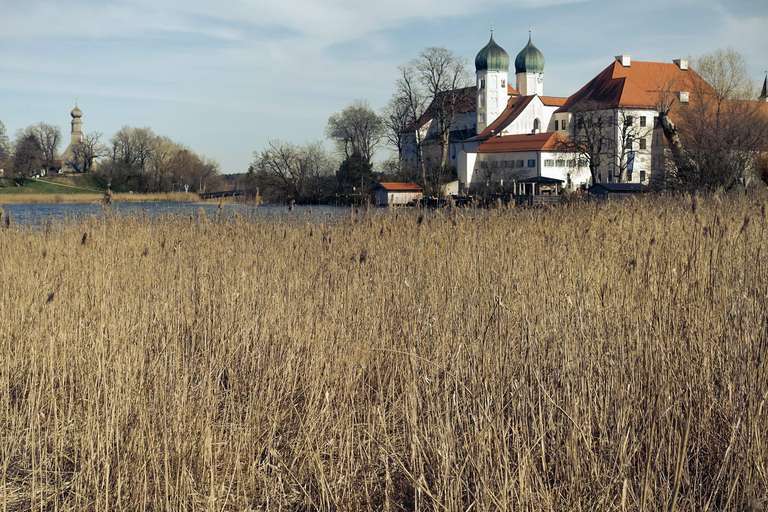 Bald wechseln wir in die Mulde von Seeon mit der pittoresken Klosterinsel, die einen kleinen Aufenthalt lohnt. Beim Gang durchs Dorf gewinnen wir den Eindruck, dass der Ort schon einmal lebendiger war. Das muss so gewesen sein, denn Steub berichtet von einem Kurbetrieb (der wohl auf 1815 zurückgeht), dessen Badegäste „zur nachmittäglichen Kaffeezeit [...] in großer Anzahl“ nach Seebruck gepilgert sind - weshalb sich die Wanderung nach Seeon gerade zu dieser Nachmittagszeit anbiete, wenn man „diesen geselligen Freuden etwa ausweichen wollte.“ Auch die Geschichte des Klosters ist sehr wechselvoll und währte von vor 1000 bis zur Säkularisation 1803, zeitweilig gehörte es zu den bedeutendsten Klöstern des Reiches. Herr Hofmiller war nicht sehr angetan vom zwar „geschichtlich anziehenden, aber künstlerisch unerfreulichen Gemisch“ im Inneren der Klosterkirche. Ein reiner Stil ist kaum auszumachen, dafür wird aber die Schichtung von Zeit in einem solchen Gehäuse umso erfahrbarer? Dazu gehört auch, dass sich kaum barocke Spuren finden, ungewöhnlich für eine solche oberbayerische Kirche. Doch damals ging es den Klosterfinanzen nicht gut, erst später erholte man sich wieder. Es folgte eine Blütezeit, in der auch Haydn und der junge Mozart öfter einmal zu Gast waren. Heute gehört das Klosterareal dem Freistaat bzw. dem Bezirk Oberbayern und beherbergt eine Bildungsstätte mit Kulturangebot und Gastronomie in stilvollem Ambiente.