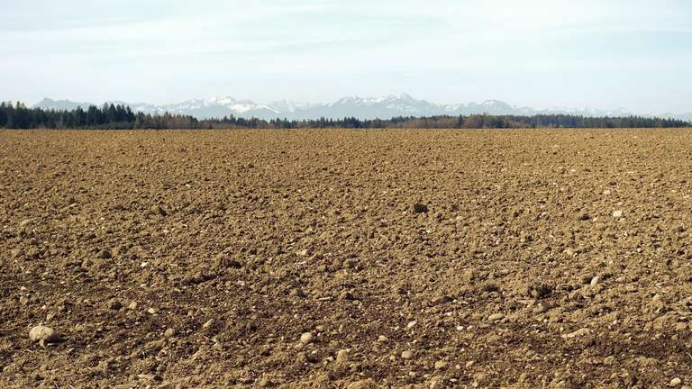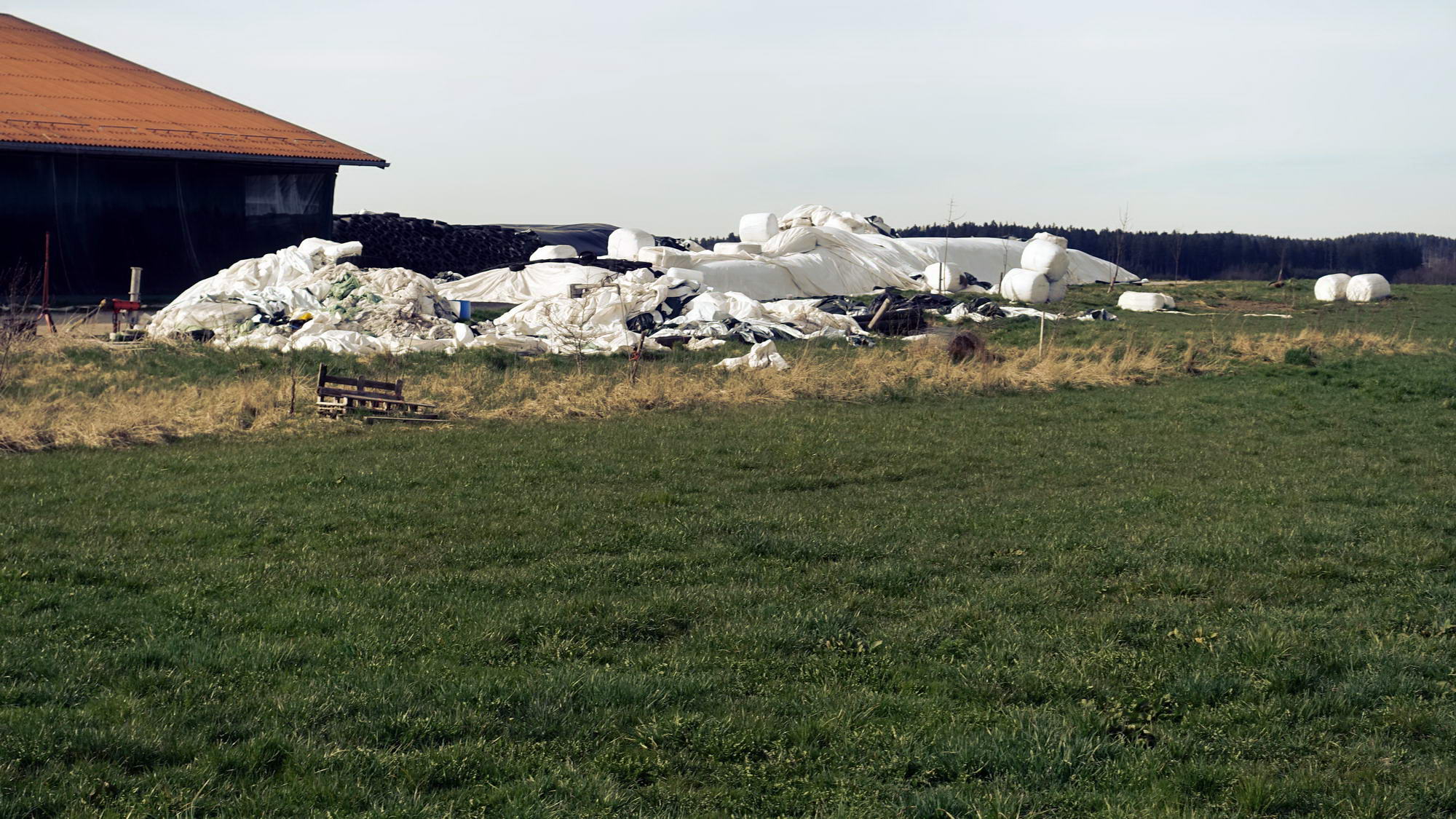 Nach Großbergham hinauf müssen wir auf der Straße gehen und die Aussicht weitet sich wieder. Wundersamer Weise überschreiten wir dort unbemerkt die Grenze nach Missouri, so kommt es uns vor: Zwischen den Feldern und weit abseits des Dorfs liegt eine große LKW-Werkstatt - wie kommt die hierher? Die Tristesse des Ortes kulminiert an einem Gehöft am östlichen Rand, so sich abgeräumte Silofolien zu Bergen türmen, ein kahles, kaltes Anwesen, das so gar nicht zur heimatlichen „bäuerlichen Landwirtschaft“ passen will, wie sie immer behautpet wird. Das kündet viel mehr von Abnutzung von Landschaft und Ressourcen, ohne Sinn für ihre dauerhafte Pflege, wie sie der Landwirtschaft eigentlich obliegen. Auf dem weiteren Weg nach Obing werden die Eindrücke nicht besser, die Landschaft ist leer und ausgeräumt, kalt und zugig, im Siedlungsbereich wird es kaum anders.