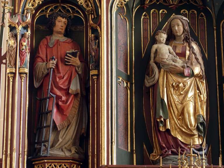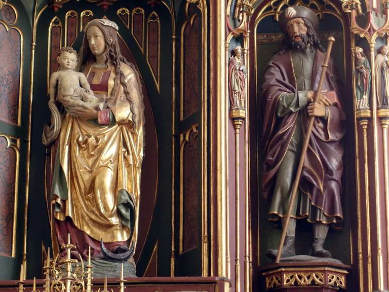 Erst am nächsten Morgen, als wir in mildem Licht noch ein paar Schritte durch die Ortsmitte gehen, wird der Eindruck etwas versöhnlicher. Obing liegt am historischen bayerischen Jakobsweg von Passau nach Kempten, in der St. Laurentius-Kirche finden sich am Altar drei schöne Figuren, 500 Jahre alt, sie werden dem spätgotischen „Meister von Rabenden“ zugeschrieben: im Zentrum Maria mit Kind (Muttergottes), links der namengebende Laurentius, rechts Jakobus mit der charakteristischen Muschel.