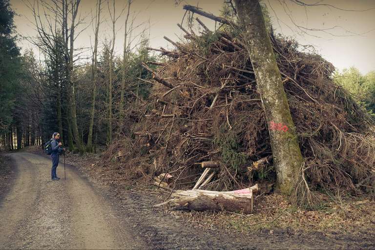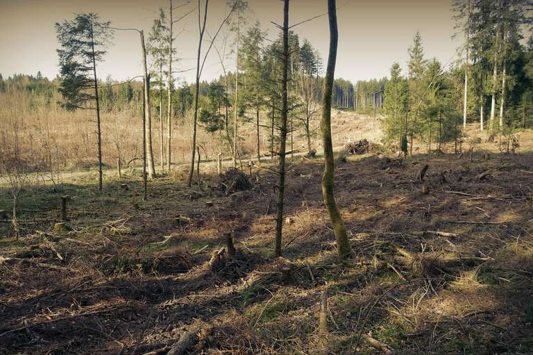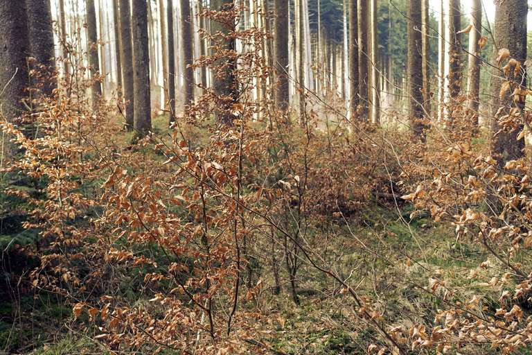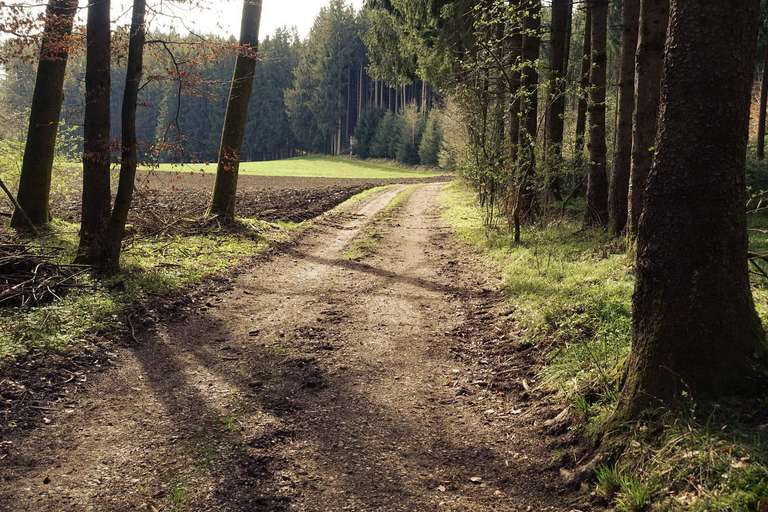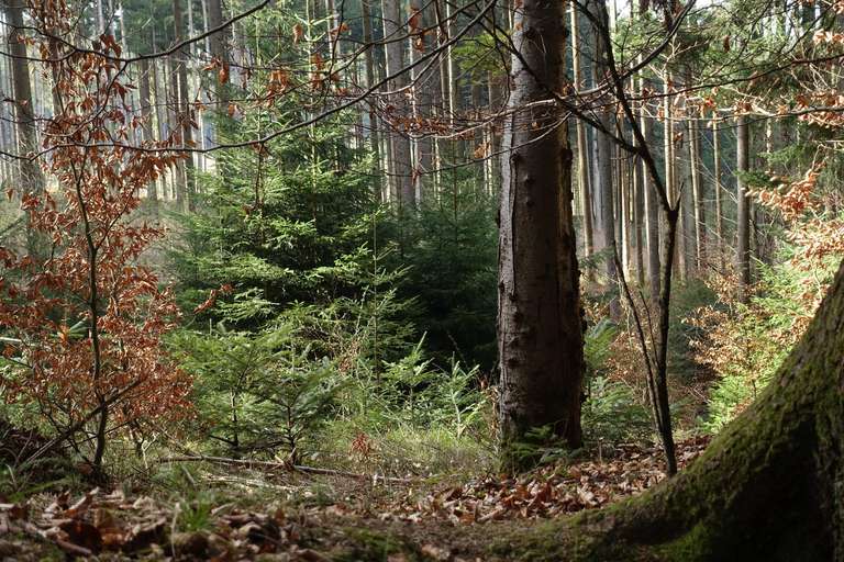 Das ist jetzt einige Jahre her, passt aber zu diesem Morgen. Missouri kennen wir jetzt, also machen wir uns (im Geiste) auf nach Westen, der hier eher in südlicher Richtung liegt. Kansas ist ein dichter Fichtenforst, der am Zusammenbrechen ist. Bergeweise wird die Fichte herausgerodet, die Buchenverjüngung zeigt sich und mit (amerikanischen) Douglasien soll krisenfest nachgeholfen werden. Ob die Rechnung aufgeht? Die Karte nennt den Flurnamen „Lohholz“ für diesen Wald, war es also einmal ein (natürlicher) Eichenwald gewesen? Die Kiesstraße durch den Wald jedenfalls ist alt, wie sie vermutlich zu Steubs Zeiten schon war - damals gab es keine Wanderwege, wozu auch, Geschwindigkeit und Anforderungen aller Verkehrsteilnehmer auf solchen Straßen waren sich weitgehend ähnlich.