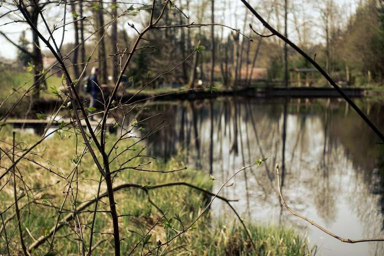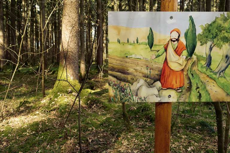 Pfad und Gelände werden spürbar kleinteiliger, das einst dynamische Geschehen der Eiszeit bildet sich deutlich ab in den längs und quer verlaufenden Moränenwällen. Im Niederhamer Holz, auch eine aufgeworfene Randmoräne, finden wir Stationen einer Waldmesse (?) - oder ist es ein Wanderheiligtum der Indigenen, dringen hier Schwingungen aus der Urzeit an die Oberfläche, wie in den Black Hills? Wir wähnen uns weitab und sind doch mittendrin? - Nach einer morastigen Passage und vorbei am Mühlenweiher erreichen wir den lauschigen Flecken Bachham. Da lässt es sich offenbar gut leben, wie wir in einem Gespräch am Wegrand erfahren, bei einem preisgekrönt erneuerten Bauernhaus, in dem nun etliche Familien wohnen. Wir sind nach Oberbayern zurückgekehrt. Als bei der Mittagsrast am stillen Pelhamer See ringsum das Zwölfuhrläuten anhebt, besteht kein Zweifel mehr.
