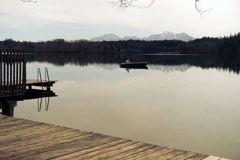 Wir gehen ein Stück weiter neben der recht befahrenen Straße und zweigen dann ab zum Badeplatz am Langbürgner See. Ein öffentlicher Badeplatz in der Waldeinsamkeit (wenigstens um diese Zeit), ohne Parkplatz und ein Stück Wegs zu gehen. Sehr schön. Ein Wasserwachtler tut Dienst, in dem er sich auf dem Boot sonnt. Die Badegäste kommen erst noch. Nach einigen weiteren Schlenkern im Wald durch einen Moränengürtel hindurch kommen wir auf der Höhe über Bad Endorf an: der „Panoramaweg“ bietet überraschend schöne Sicht über den Simssee und die Voralpen weiter im Westen. Ein gelungenes Finale!