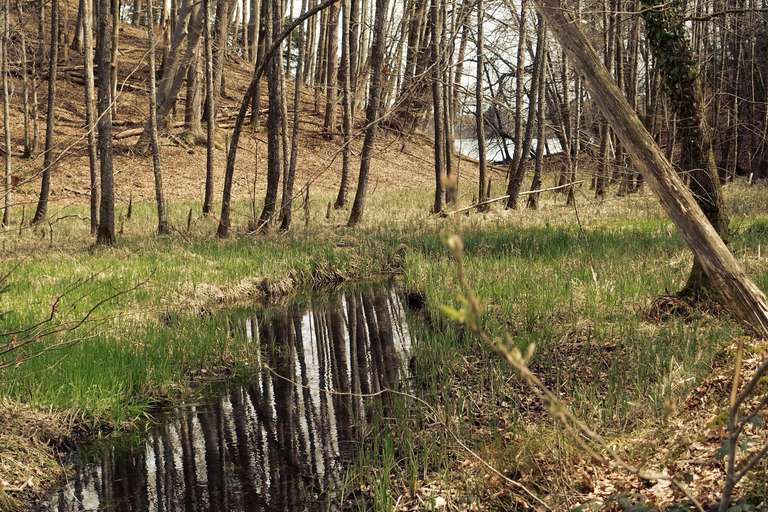 An der sog. Mozarteiche vorbei führt der Weg in das Gebiet der Seeoner Seen (NSG) und damit in ein Gelände, das für den Rest unserer Wanderstrecke bis zum Schluss prägend sein wird: die sog. „Eiszerfallslandschaft“, hier in einer besonderen Ausprägung. Von Seeon bis zur Eggstätter Seenplatte reicht eine Zone, wo Inngletscher und Chiemsee- bzw. Achengletscher sich mehrfach aneinander „rieben“, die jeweiligen Endmoränen ver- und überschoben und teilweise ein sehr kleinteiliges Relief in der heutigen Landschaft hinterlassen haben. Dazu gehören auch die zahlreichen kleinen Seen, die auf im Untergrund zurückgebliebene und später abgeschmolzene Eislinsen zurückgehen, sog. Toteislöcher. Schon unsere Wanderung am Westrand des Inngletschers führte an solchen Seen entlang. Der Biotopverbund Eggstätt Hemhofer Seenplatte und Seeoner Seen soll das Bewusstsein für die Besonderheit dieser Naturlandschaft fördern und ihre Qualitäten und Artenvielfalt erhalten. Unser Weg führt zwischen Griessee und Brunnensee hindurch, sie sind von großen Sümpfen und Niedermooren umgeben, verlandeten Bereichen, die auf eine einst deutlich größere Gewässeroberfläche hindeuten.