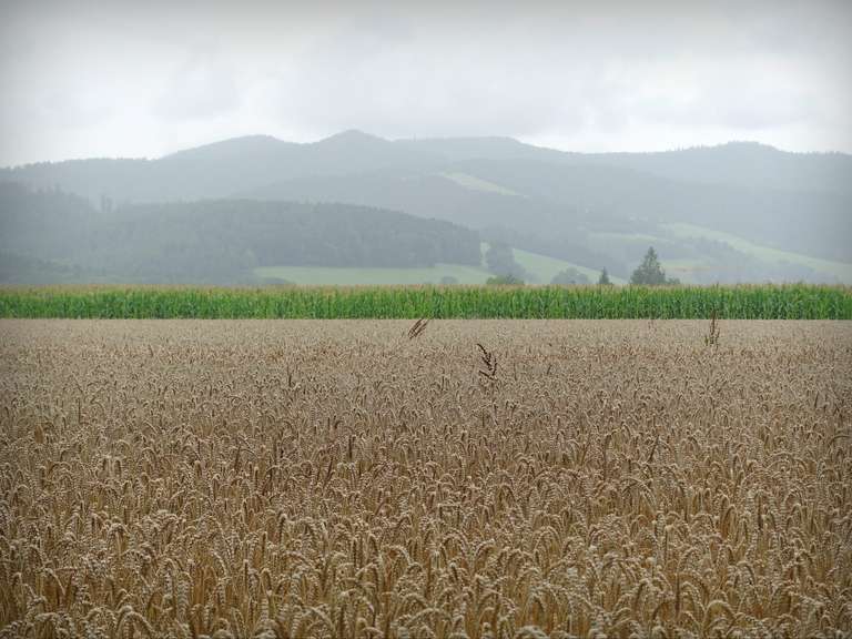 Wir gehen noch eine Weile weiter und rasten dann bei der St. Wendelinskapelle, zugleich dem höchsten Punkt heute. Gute Entscheidung, denn fortan verliert der Weg deutlich an Attraktivität, erst Forstweg, später viel Straße. Bis Stegen geht es immer am nördlichen Talrand entlang, 1934 mag das noch ein staubiger Schotterweg gewesen sein, heute dominiert harter Asphalt. Erst südlich des Ortes, entlang des Wagensteigbaches folgt wieder ein freundlicherer Abschnitt mit schönen Ausblicken über die Felder zu den Waldbergen um uns herum. Doch jetzt zieht auch der Regen herein und wir eilen Himmelreich entgegen. Um dort hin zu gelangen, müssen wir den Querweg wieder eine Weile verlassen. Entgegen der Kartenaussage ist der Durchgang am Jockelshof ausdrücklich unerwünscht, also weichen wir auf einen verwucherten Feldrain aus, nicht nachahmenswert. (Später lese ich, dass solche Schilder außerhalb geschlossener Ortschaften keine Relevanz haben, wenn sie nicht stichhaltig begründet sind oder von einem verschlossenen Tor begleitet werden, das gilt wenigstens für Bayern.)
