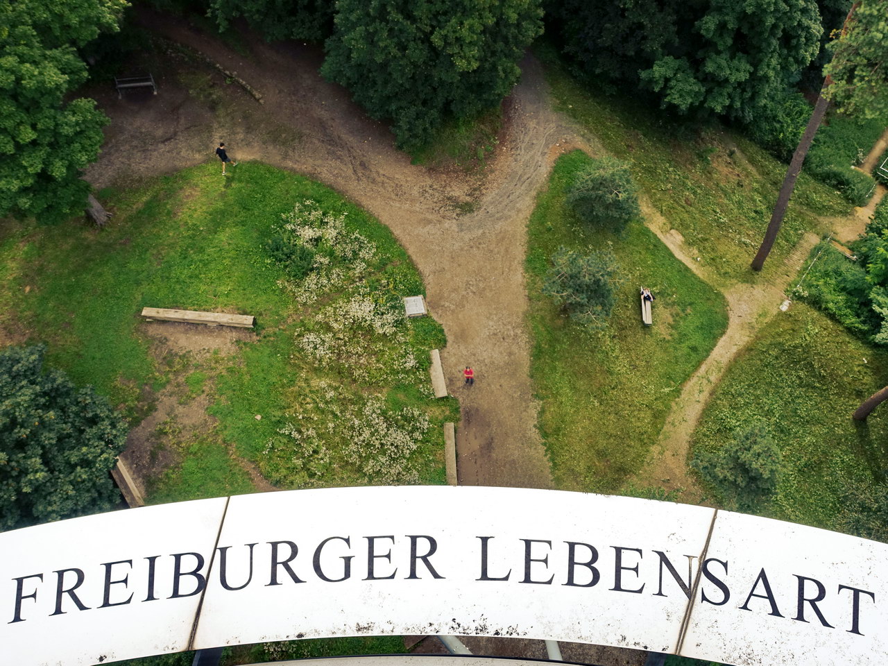 Wir beginnen die Tour gleich mit einer Variante (offiziell beginnt der Westweg am Schwabentor), steigen den Westhang des Schlossbergs hinauf, mit schönen Ausblicken auf die Altstadt. Auch lockt, trotz nur mäßiger Fernsicht, der Schlossbergturm. Schönes Beispiel dafür, was man im wirklichen Leben mit Geradenschar, Ringen und Spiralen so anstellen kann (meint jemand mit mathematischer Denkstruktur, womit sie recht hat). Viele Pfade führen durch das Gelände der ausgedehnten ehem. Vauban-Festung, laden zu eingehenderer Erkundung ein, doch wir wollen ja hinaus in den Wald.