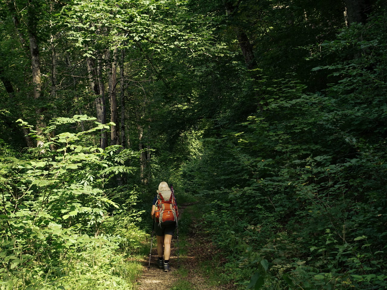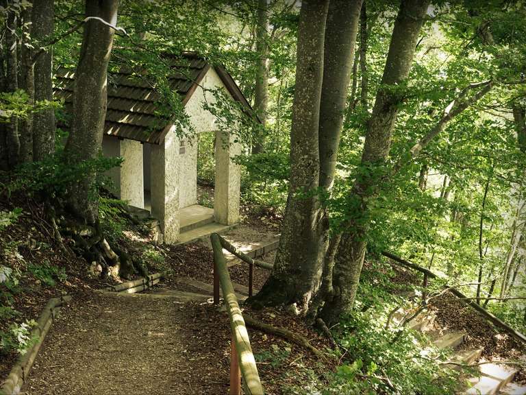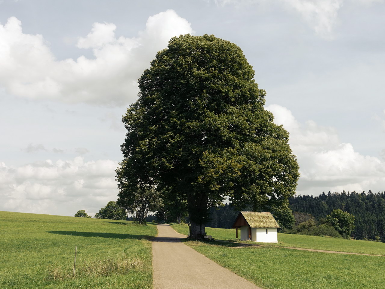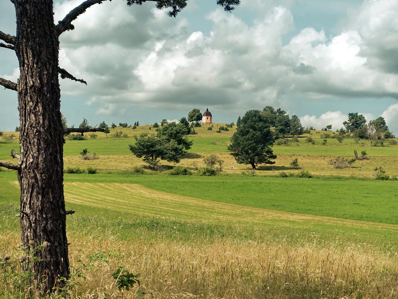 Anschließend windet sich der Pfad eine kleine Weile recht steil hinauf auf die Albhochfläche beim "Glatten Fels", dessen Weißjura-Wand wir vom Tal aus schon gesehen hatten. Nach einer längeren ruhigen Passage im Buchenwald, liegt rechterhand der Allenspacher Hof, ein altes Gehöft, das heute ein kirchliches Freizeithaus ist. Leider lese ich erst hinterher, dass im Hof eine alte Sommerlinde steht, die 1450 gepflanzt wurde, der älteste Baum im ganzen Landkreis. Beim Schäferbrunnen erreichen wir das Schäfertal, wie das obere Lippachtal heißt, verlassen es aber bald wieder und wandern, zuletzt durch heideartiges, mit einzelnen Kiefern und Wacholdern durchsetztes offenes Gelände hinauf zum Alten Berg (980 m). In der Wärme verströmen die Kiefern ihren Harzgeruch, weiter unten am Hang zieht eine Schafherde durch, das wirkt kurzzeitig sehr südlich. Die hundertjährige Kapelle interessiert uns nicht weiter, die Aussicht hätte überragend sein können, wie die Panoramatafel ausweist. Über den Kreuzweg steigen wir in Richtung Böttingen ab, dort verläuft der markierte Weg erst umständlich an der Straße und am Ortsrand entlang, um dann doch in den Ort hinein zu führen. Und dann "hat der Spaß ein Loch", wie man in München sagt.