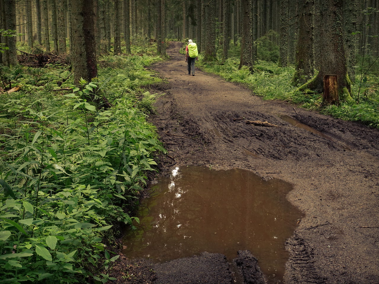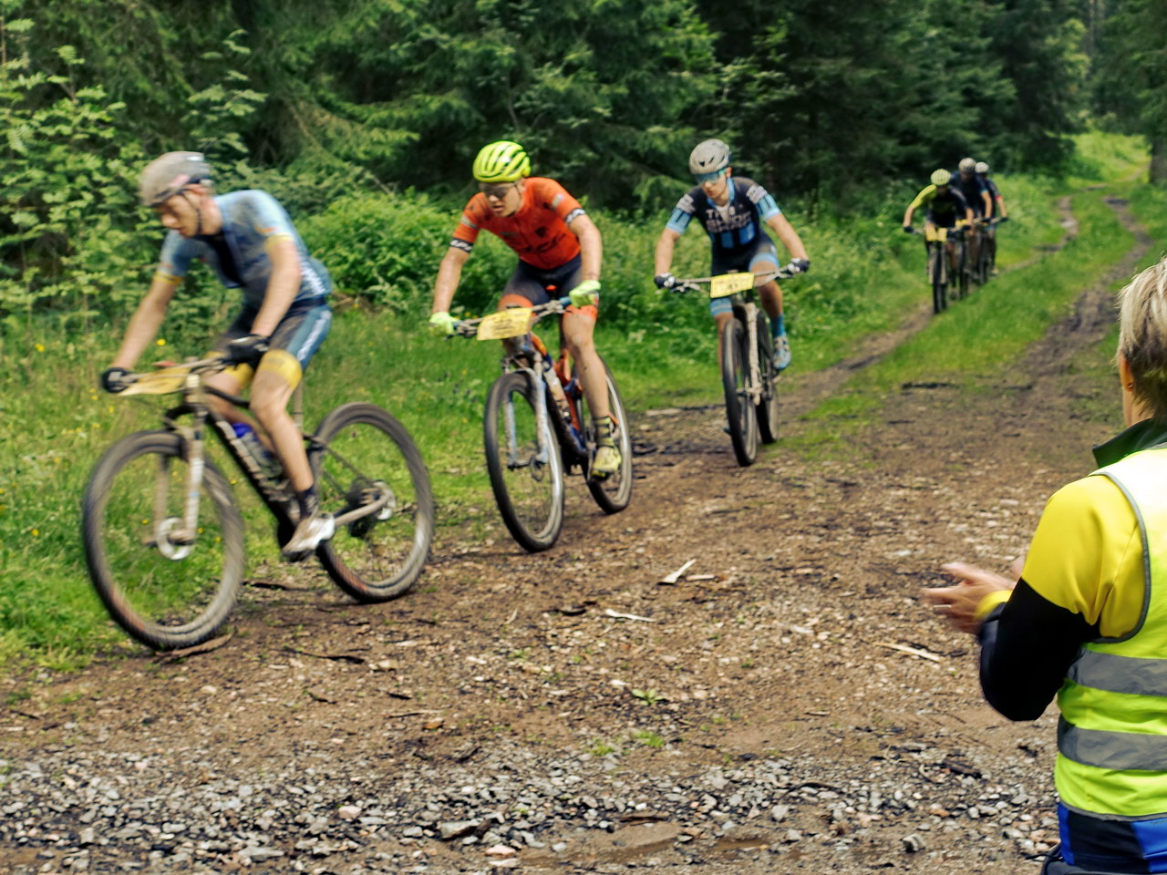 In die Waldstille bricht plötzlich eine Enduro-Maschine, die auf uns zubraust und neben uns anhält. Was willst du? Das Schild "Orga" macht uns stutzig. Ob wir wüssten, dass hier gleich ein Mountainbike-Rennen vorbeikommt, so 300 bis 400 Fahrer? Gleich heißt in fünf bis zehn Minuten. Alles klar, wir sind bereit ins Gebüsch neben dem Weg zu springen. Die Vorhut braust weiter und nach einer Kurve treffen wir auf einer Wegkreuzung auf weitere Mitglieder der "Orga", die hier auch einen Harvester der Forstbetriebe aufgehalten haben. Es handelt sich um den "Rothaus Bike Giro Hochschwarzwald", eine viertägige und wohl durchaus bedeutsame Tour für Profis und Amateure, heute ist die zweite Etappe. Während wir uns das erzählen lassen, taucht die Spitzengruppe aus dem Wald auf, in Führung liegend Simon Stiebjahn der Lokalmatador vom Titisee, an dritter Position das Gelbe Trikot, Ian Millenium aus Dänemark. Millenium wird Etappe und Tour gewinnen, Stiebjahn jeweils Zweiter werden. Vor Jahren standen wir einmal bei der Deutschlandtour am Straßenrand bei Plauen. Da war das beste die Werbekolonne, die uns mit Käse für den ganzen Resturlaub versorgte. Werbekolonne gibt's hier nicht, dafür schöne Eindrücke eines matschigen Rennens. Und wir erinnern uns daran, wie wir vor vier Jahren bei Courmayeur in einen riesigen Berglauf geraten sind, bei dem wir auch noch irgendwie mitlaufen mussten...