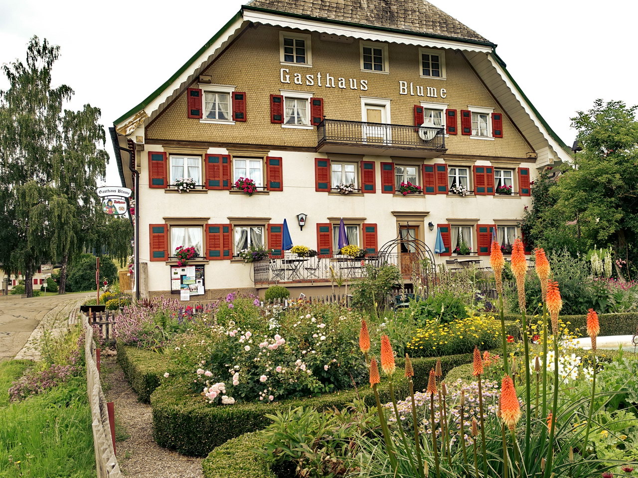 Eine Weile später treten wir aus dem Wald hinaus ins Hochtal von Kappel und können in der Ferne den Feldberg sehen. Direkt am Weg liegt das Gasthaus Blume, eigentlich ein Muss für eine Einkehr, ein echtes Kleinod und Gesamtkunstwerk aus Haus, Gaststube und üppigem Stauden- und Blumengarten. Die frische Bohnenrahmsuppe passt dazu.