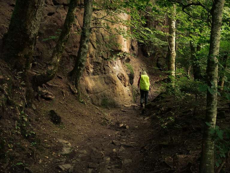 Dann zieht der Weg allmählich in die Wutachschlucht hinunter und der Wald beginnt uns wieder aufzunehmen. Beim Einstieg in die Schlucht kommt eine geleitete Jugendgruppe heraufgestapft, schwer bepackt und mit verdrossenen Gesichtern. Ich schnappe nur auf, wie die "Chefs" sich kurz darüber austauschen, dass hier tatsächlich "Naturschutzgebiet" stehe. Haben sie das nicht gewusst? Wollten sie in der Schlucht ein Zeltlager abhalten? Hat ein Ranger sie vertrieben? Was war denn das für eine Vorbereitung? - Alles freilich Spekulation, nachgefragt habe ich nicht aber wundern täte es mich nicht. Wild Zelten ist ja gerade wieder so was von angesagt, insbesondere an den empfindlichsten Naturorten...