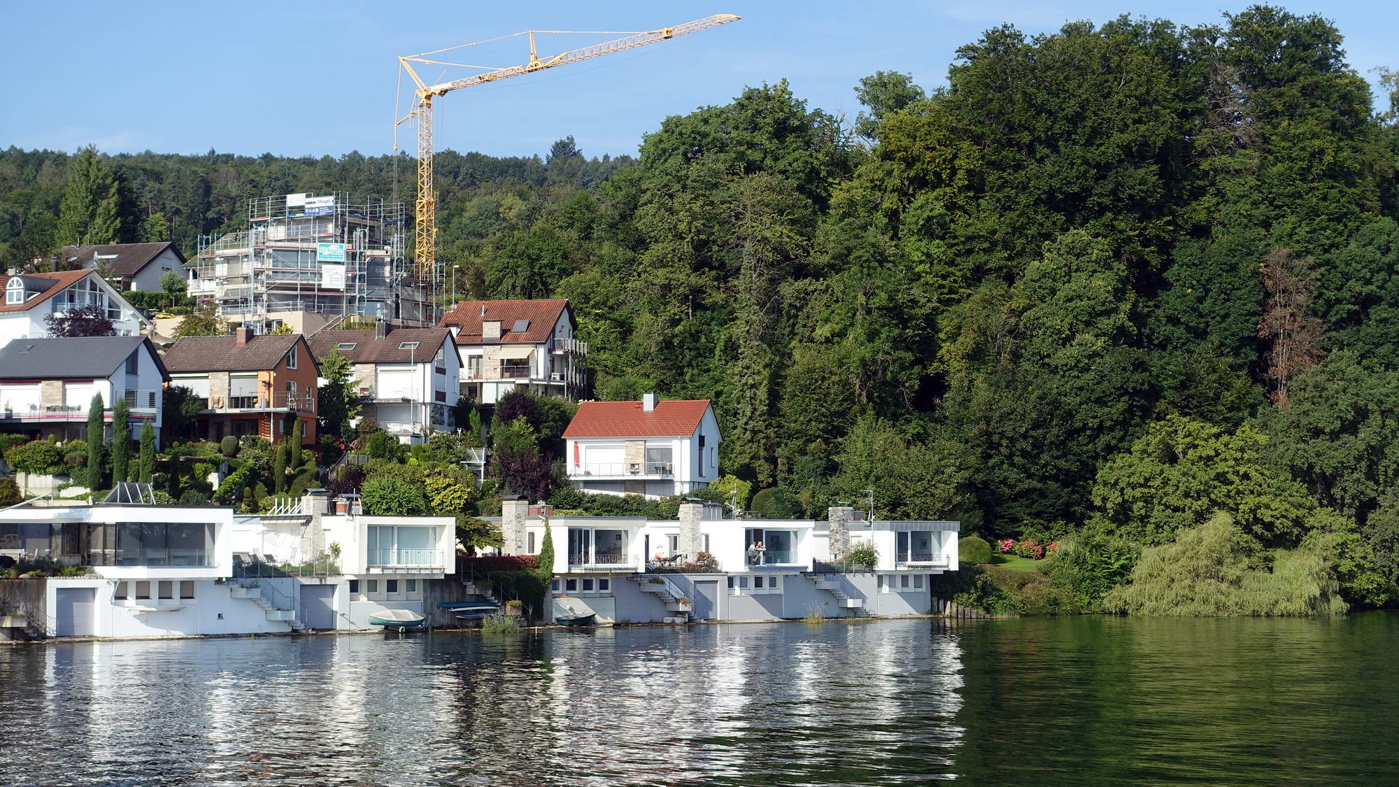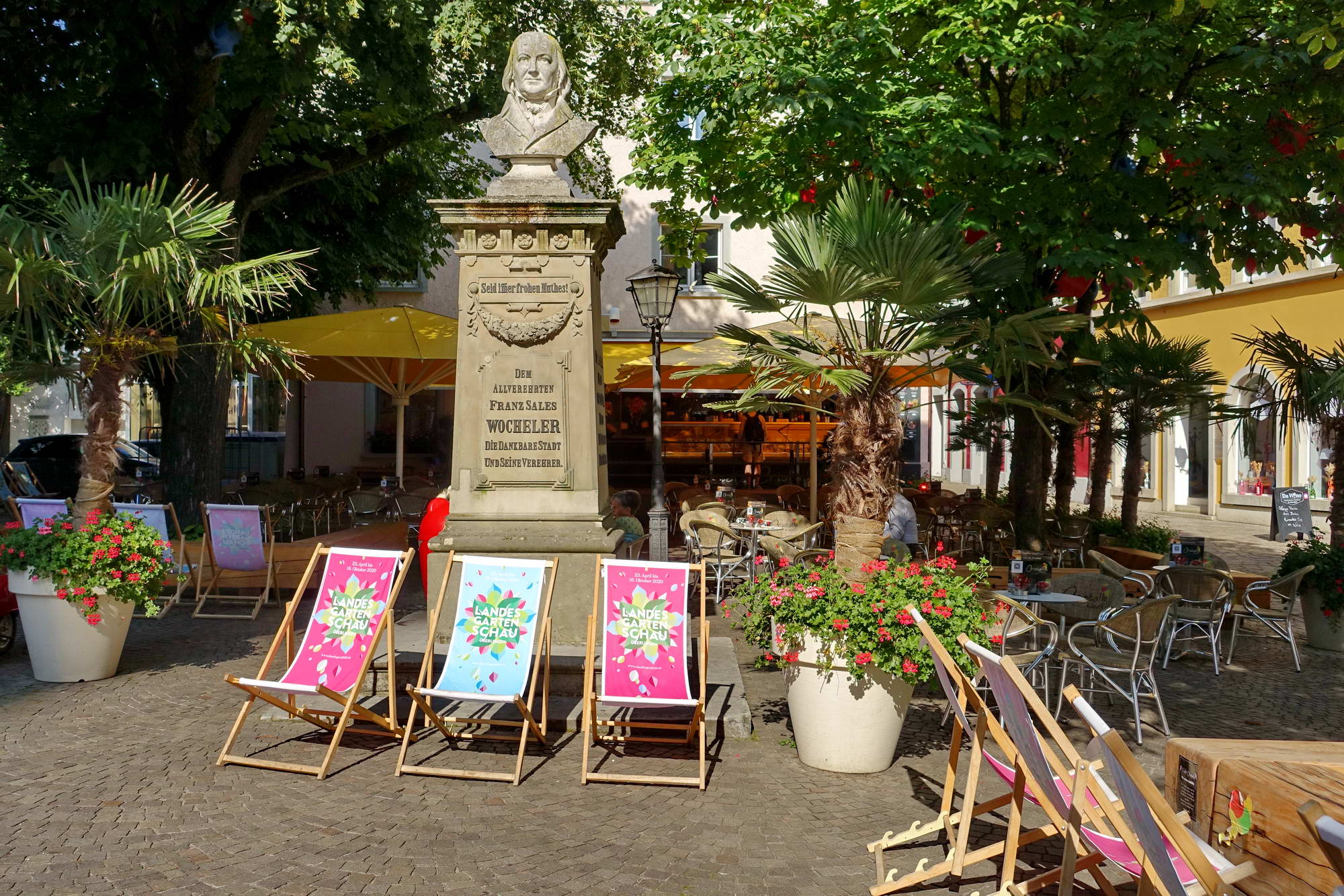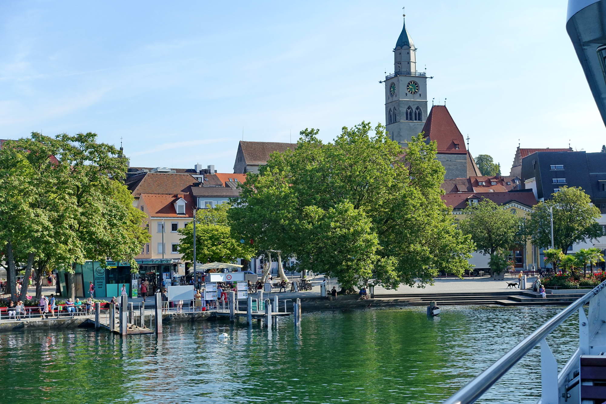Mit dem Stadtbus sind wir in fünf Minuten am Fährhafen in Wallhausen. Beim Warten auf die Fähre lernen wir ein wenig über das Schifflefahren am Bodensee. Nebenan wird eine Motorboot-Mietyacht zu Wasser gelassen. Sie wird mit/vom Trailer über die Straße von irgendwo ganz anders am See herangekarrt und dann am Wunschort „geslippt“. Dann hievt man Kühlboxen und die eigenen schweren Leiber an Bord, wirft den Motor an und dröhnt auf den See hinaus. Wie wir später sehen werden meist nur, um nicht weit vom Ufer einen sonnigen Ankerplatz einzunehmen, der idealerweise von möglichst vielen Passanten eingesehen werden kann. Man will ja zeigen, was man (gemietet) hat… – Wir buchen die einfache Fahrt nach Überlingen. Das freut mich jedes Mal, wenn ich mir ein One-Way-Ticket kaufen kann, das ist wie eine Verheißung (oder auch ein Sinnbild des Lebens). In einer Viertelstunde haben wir übergesetzt und laufen im hübschen Überlingen ein. Weil Landesgartenschau ist, herrscht schon am Morgen reger Betrieb. Wir drehen nur eine kurze Runde durch die Innenstadt, die ihr südliches Flair nicht verhehlen kann, vermutlich lebenswert. Eine Weile dürfen wir noch am Seeufer gehen, bis wir die Bezahlschranke der Gartenschau erreichen und dann wieder ins Hinterland ausweichen.