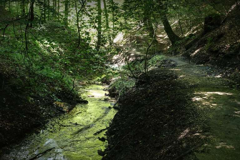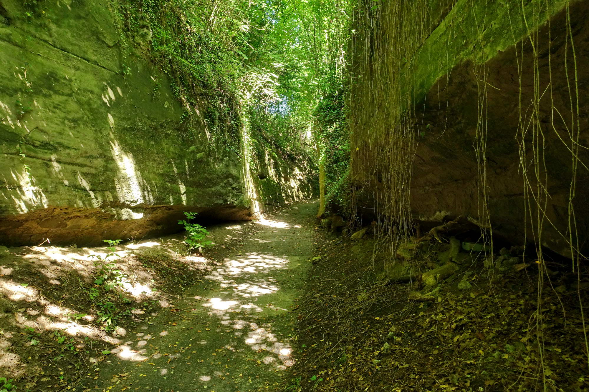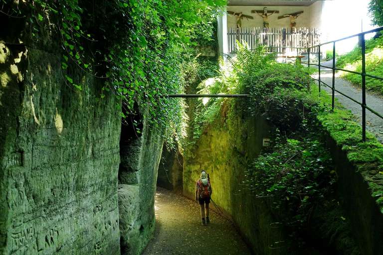 Der Überlinger See ist geprägt von Steilufern, die aus den verschiedenen Molasse-Schichten herausgeschürft wurden, jüngeren und recht weichen Sedimentgesteinen aus dem Tertiär, die vom späteren Vergletschern und Abschmelzen überformt wurden. Die Tour handelt hauptsächlich von der Überschreitung des Sipplinger Berges, einer besonders prägnanten Molasseformation, wo wir an verschiedenen Stellen den geologischen Besonderheiten dieser Landschaft begegnen. Das geht schon los beim Verlassen von Überlingen, wo der Wanderweg (HW9) durch den Hödinger Schluchtweg führt, einem schluchtartigen Hohlweg, der seit dem Mittelalter aus dem weichen Sandstein herausgearbeitet wurde. Da wird es selbst am sonnigsten Tag richtig finster und man sieht kaum, wer einem entgegenkommt. Nach der Querung der B 31 steigen wir kurz durch die Weinberge, wo schlagartig Bilder aus dem Wallis vor vier Jahren lebendig werden. Oberhalb befindet sich die Gletschermühle, eine nahezu kreisrunde Ausschürfung aus der Molasse aus der Eiszeit, eine der größten ihrer Art (Geotop, Naturdenkmal).