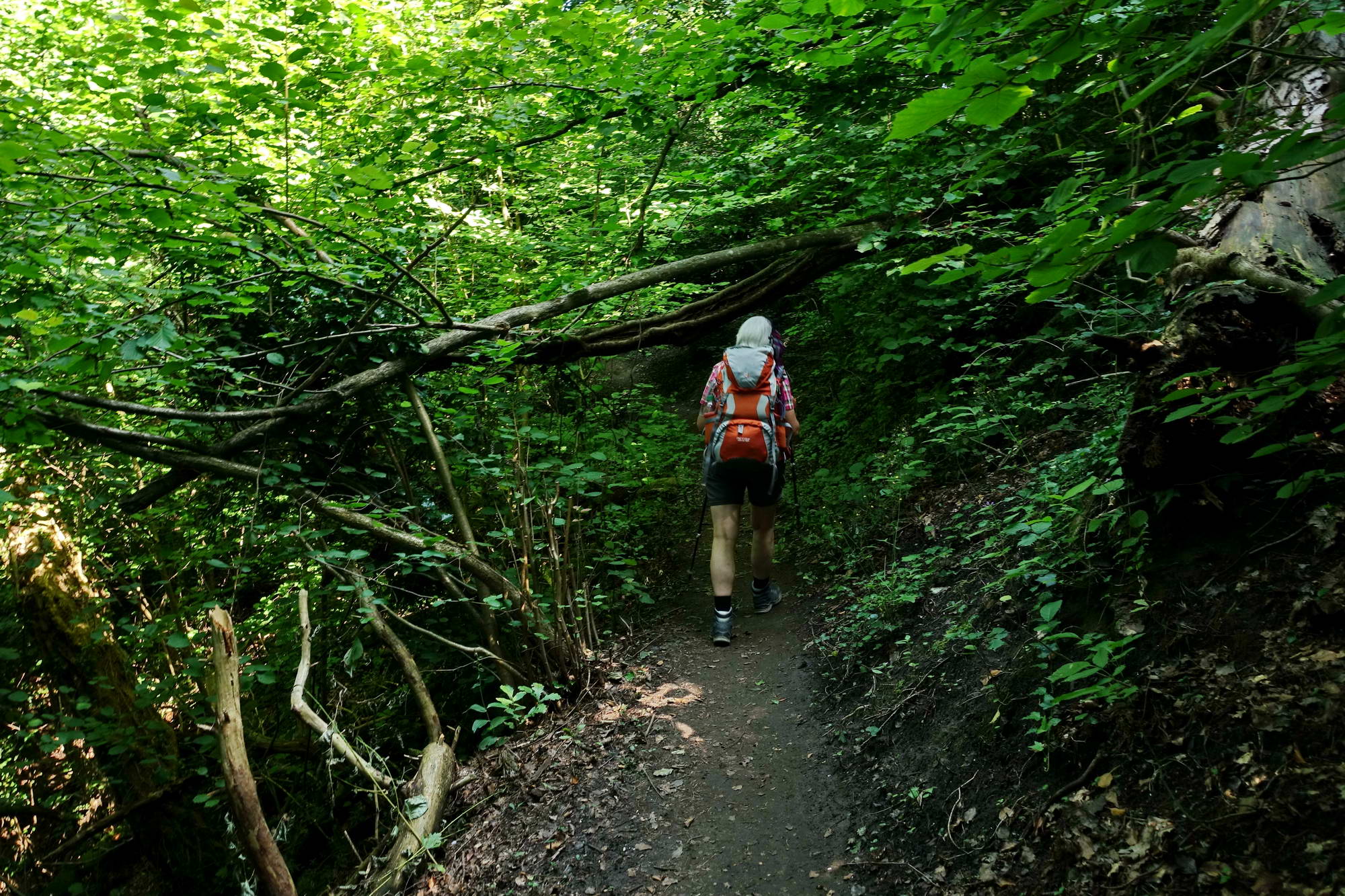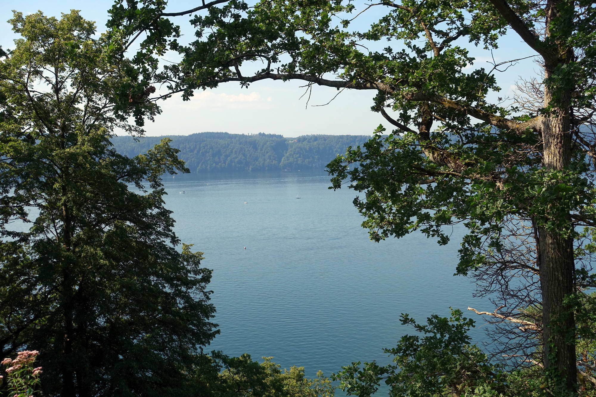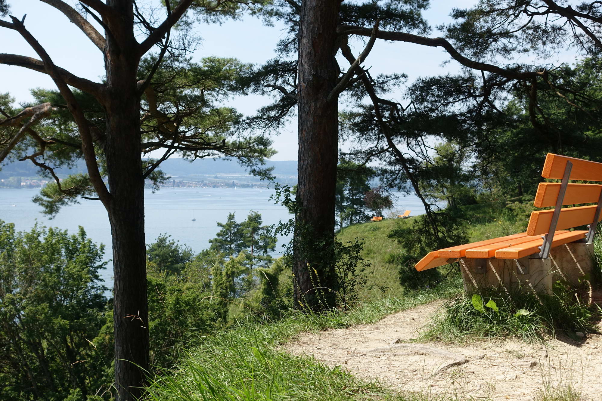 Auf dem Waldpfad umgehen wir den südlichen Ortsteil von Hödingen (durch den Ort wäre kürzer und einfacher gewesen), einzelne Sichtfenster nach Sipplingen und über den Überlinger See. Nach dem Ort durchwandern wir den Hödinger Tobel, wieder so eine kleine, wenig tiefe aber sehr schattige Schlucht, wie sie hier häufig in den weichen Gesteinsschichten vorkommen – ähnlich der Katharinenschlucht am gegenüberliegenden Seeufer. Vor dem Aufstieg zum Sipplinger Berg finden wir einen schattigen Rastplatz mit gerahmtem Blick in Richtung Konstanz und Mainau. Es bleibt dunstig mit eingeschränkter Fernsicht, so dass wir beschließen, eine kühlere Waldpassage dem Aussichtspunkt auf dem Berg vorzuziehen, so gehen wir fast eben weiter zum Haldenhof. Dort ist man als Fußreisender ziemlich fehl am Platz, alle Plätze sind schon belegt von Leuten, die ihr Fossilmobil auf dem Parkplatz nebenan abgestellt haben – schnell weiter.