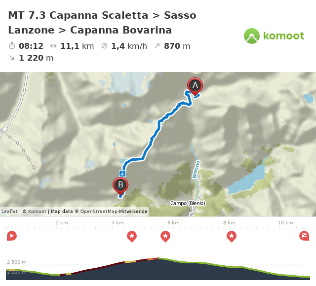 Hinweis Sentiero degli Stambecchi/Steinbockweg: Der ursprünglich weiß-blau markierte Weg (Alpine Route, T4) ist inzwischen als rot-weiß-markierter Bergwanderweg (T3) ausgewiesen, weil alle kritischen Stellen mit fixen Seilen oder Tritten versehen und die wenigen etwas ausgesetzten Stellen somit deutlich entschärft wurden. Dennoch sollte eine Begehung nur bei hinreichender Bergerfahrung unternommen werden: der Aufstieg ist anstrengend, das grobe aber griffige Blockgelände am Grat des Sasso Lanzone und der unmittelbare, etwas bodenlose Abstieg vom Grat sind nicht jedermanns Sache. Auch die im Flyer zum Steinbockweg angegebene Gehzeit von 5 h erscheint, insbesondere für Weitwanderer mit großem Rucksack, illusorisch. Von 6 bis 7 h von Hütte zu Hütte sollte man ausgehen (so auch die Auskunft auf der Cap. Scaletta). Es bleibt der Eindruck, dass man einen anspruchsvollen Bergwanderweg etwas einfacher darstellt, als er tatsächlich ist, und zu sehr für jedermann anpreist, um für eine Belebung der Bovarinahütte zu sorgen. Die Hütte selbst hat das unbedingt verdient und der Steinbockweg ist eine wunderbare Bereicherung jeder Trekkingtour - aber eben nicht völlig harmlos, wie offiziell suggeriert wird.